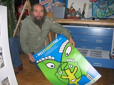 | Meinhard Bärmich mit einem seiner Plakate zum Weltkindertag. |